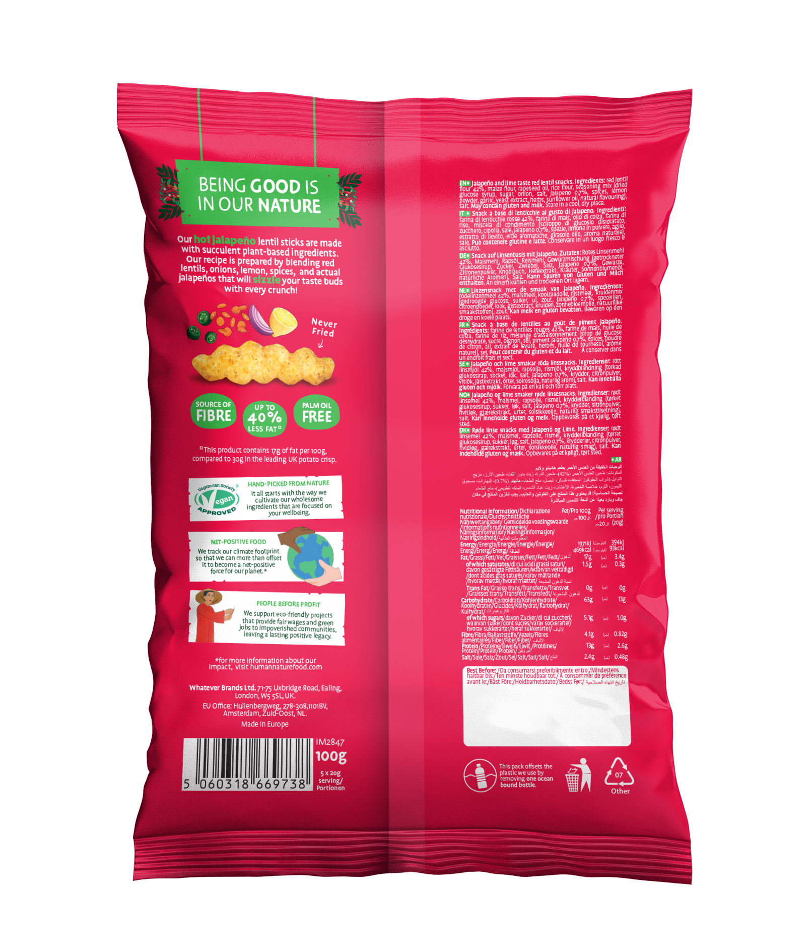 Ingredients: red lentil flour (42%), maize flour, rapeseed oil, rice flour, seasoning mix (dried glucose syrup, sugar, onion, salt, jalapeno (0,7 %), spices, lemon powder, garlic, yeast extract, herbs, sunflower oil, natural flavouring), salt.